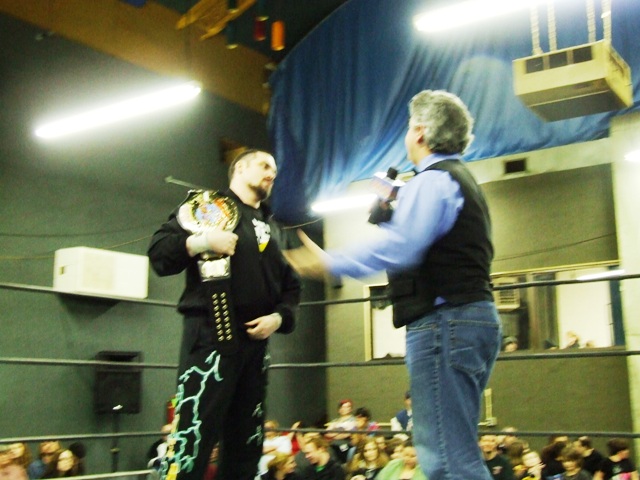 Match # 7 OSPW TV Title Match 2 on 1 Handicap Match Rex Atkins and Nick Paradise vs Bishop This match had a couple of surprises, a masked Mexican ref and then we learned it would be Rex Atkins and his hated rival, Nick Paradise teaming up in a two on one handicap match against OSPW TV Champion Bishop for the title. All three men made their entrances and Rex wasted no time turning on Nick Paradise, so this match kind of looked like a 3-way dance. All three men taking it to each other, but the only man that could be pinned was Bishop, if the title was to change hands. During the match Jaz Miles made the comment that if Bishop should keep the title he would take Bishop on! Both Atkins and Paradise took it to the champion, but could not get the job done while fighting each other over who would make the pin. Bishop pulled all the stops out and even delivered an elbow drop off the ropes! The Winner and still OSPW TV Champion Bishop After the match, the masked ref hit Bishop with a box cutter and revealed himself to be Al Jihad! But as Jihad and manager Jaz Miles tried to celebrate, their party was ended when Thunder reminded Jaz Miles that he now had to face Bishop at the next OSPW event on May 3rd